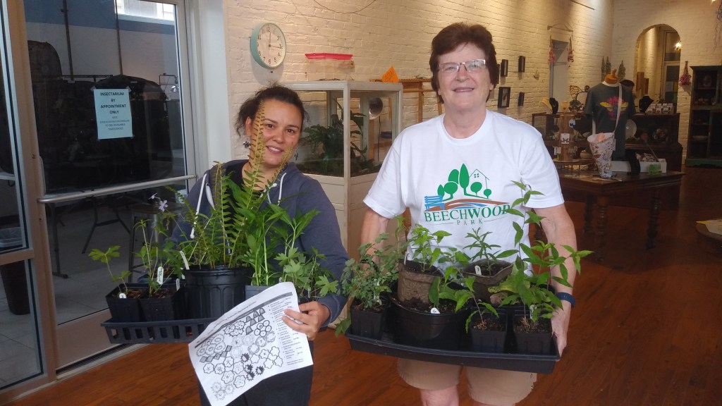 Blair Leano-Helvey of Idlewild and volunteer Jo Shipley picking up the plants.