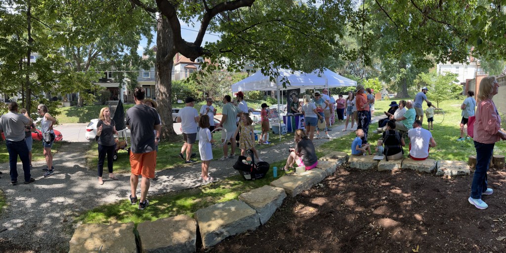 About 50 volunteers, neighbors and friends turned out today to celebrate completion of the outdoor classroom for kids including students at nearby Bloom Elementary. Among those attending: State Sen. Cassie Armstrong Chambers, who provided tremendous support when she was District 8’s Metro Councilwoman. Her successor, Ben Reno-Weber, was represented by his legislative assistant Betsy Foster. Monnik Beer Co. provided refreshments and the Highlands branch of the Louisville Free Public Library had an information table.